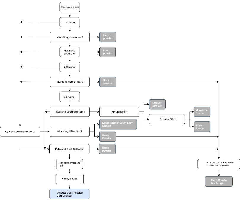 The JZ—DC2000 waste battery pole piece recovery and processing line consists of a three-stage (crushing) crushing, six-stage separation and vacuum collection system. The waste battery pole pieces discharge copper, aluminum, black powder and other recycled resources through the process of crushing, magnetic separation, crushing, screening, sorting, dust removal and vacuum collection of black powder in this production line.
