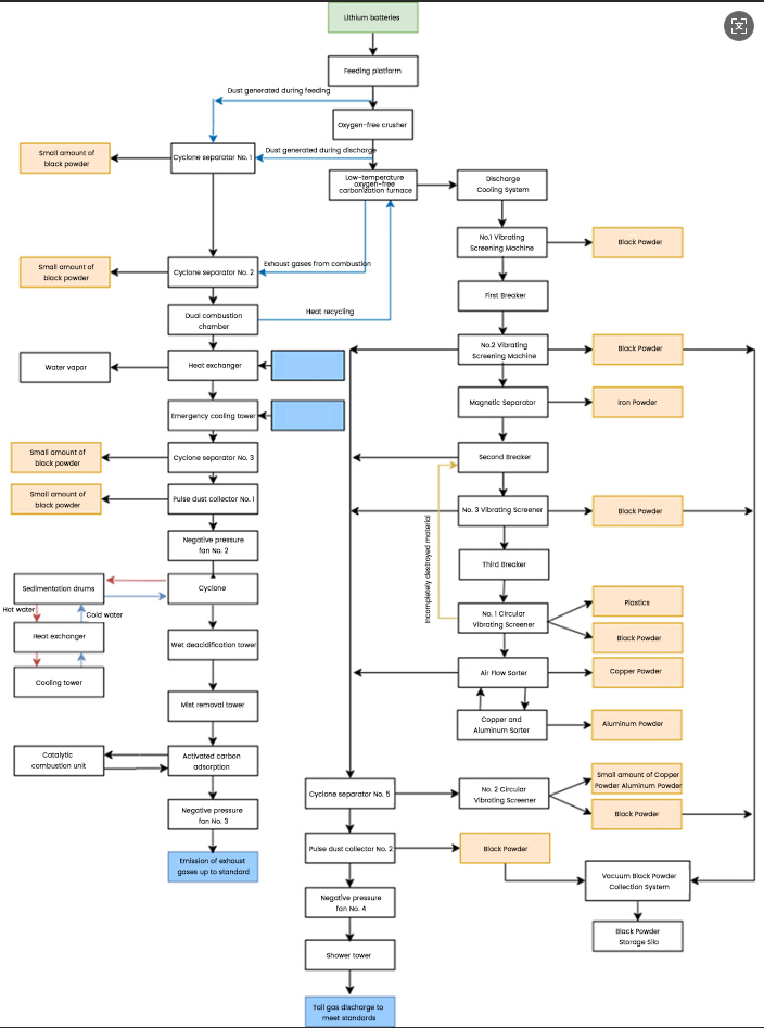 The equipment is mainly used to process waste lithium batteries, mobile phone batteries, 18650 type batteries and other dry battery materials. The black powder (containing cobalt, nickel, lithium and other components), copper and aluminum in the lithium battery are separated by oxygen-free crushing technology, oxygen-free carbonization technology, three-stage crushing process and six-stage screening process for recycling.