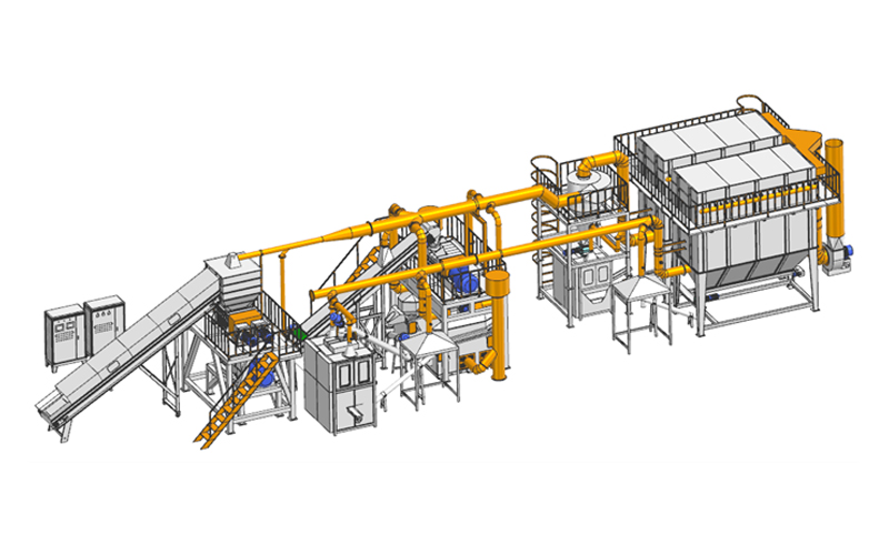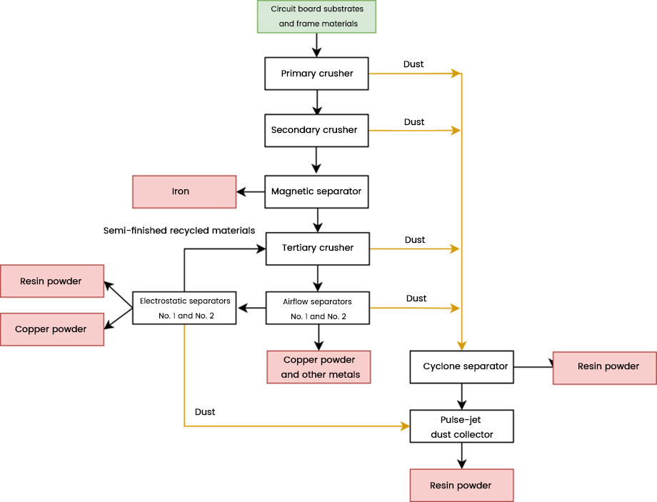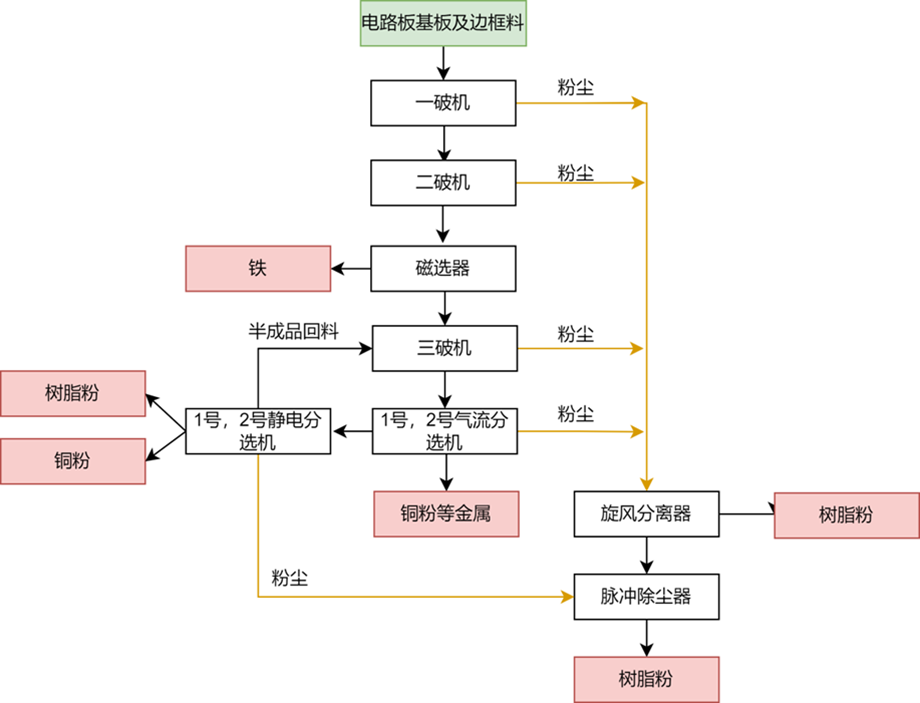 The equipment is mainly used to process circuit board substrates, circuit board frame materials, corner materials, etc., and adopts three-stage crushing and three-stage sorting processes (magnetic separation, air flow sorting and electrostatic sorting) to regenerate them into recyclable metal copper powder and resin fiber powder respectively.