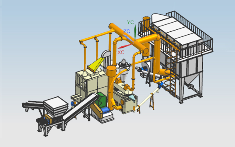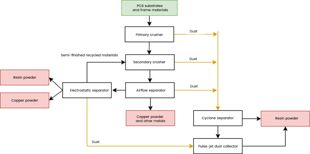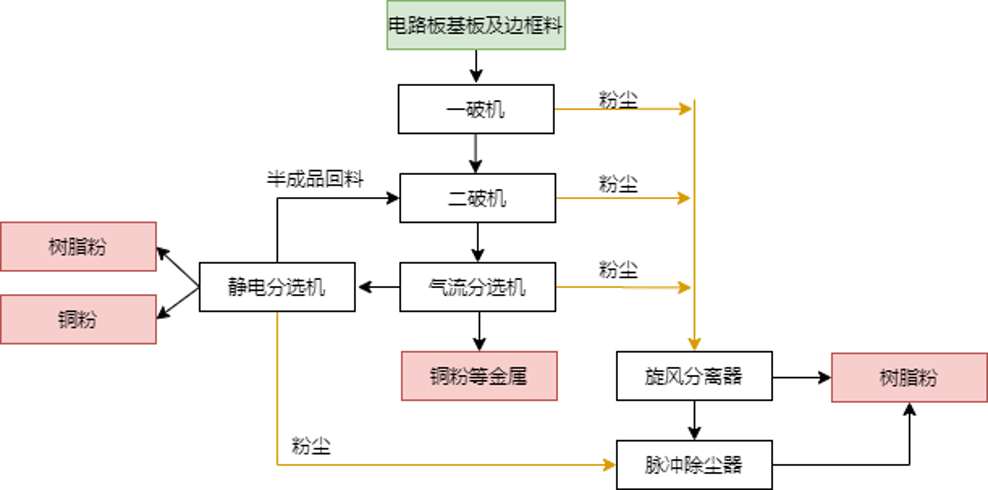 Due to the special physical properties of waste circuit boards, this equipment adopts dry crushing and sorting processes for the recycling of waste circuit boards, so that they can be recycled into recyclable metal powder and resin fiber powder respectively. First, the waste circuit board is coarsely crushed and then crushed to make it into a powdered mixture of metal and resin fiber powder; then through wind sorting, the metal components are separated from the resin, and dual electrostatic sorting equipment is used to further finely separate the semi-finished products and resin powder, thereby improving the equipment sorting rate and reducing losses. In order to prevent dust pollution during the regeneration process, a pulse dust removal device is installed after the wind sorting process, which effectively solves the dust pollution.
