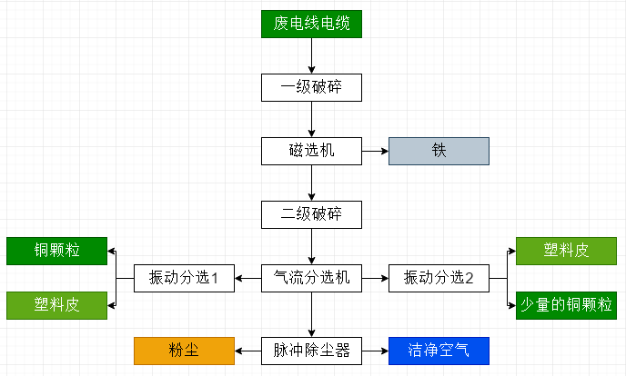 No. 1 vibratory sorting passes through the screen to separate the copper particles and a little plastic skin, and No. 2 vibratory sorting passes through the screen to separate the plastic skin and a little fine copper wire. Different vibrating screens can be set for different materials, so that the purity of the separated metal particles can reach more than 97%;